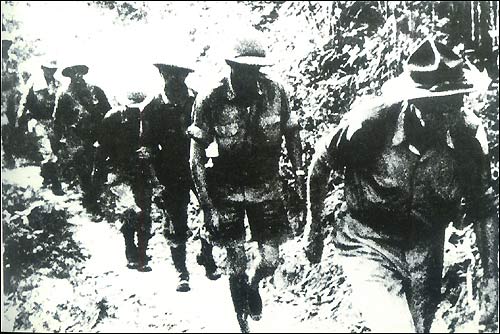 The China-Burma Road was opened in the spring of 1945. Seen here is General Stillwell with soldiers of the Chinese Expeditionary Force.