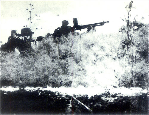 Between the summer and autumn of 1940, the Eighth Route Army started its "Hundred-Regiment Campaign," in which more than 20,000 enemy troops were wiped out. Picture shows Eighth Route Army men attacking Japanese troops during the Campaign.