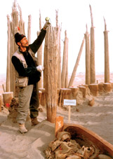 Idelisi and his fellow archaeologists began the formal excavation of the Xiaohe Tombs two years ago, with the approval of the State Administration of Cultural Heritage. On an early morning in October 2003, Idelisi and the archaeological research team he headed set off from Alagan. Their caravan first traveled northwest and passed through an expanse of withered red cedars.