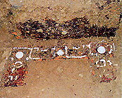 Most of the gold and silver pieces were engraved with animal and human figures. Many jewels and other treasures had been interred, among them the most precious finds were two gold tablets inscribed with patterns of the sun and the moon. Indicative of a ritual significance, they had been placed one on each shoulder.