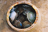 workshops must be the thousands of pottery moulds of the Western Zhou Dynasty. These were the actual moulds that were used in ancient times to produce such artifacts as ding, gui (round-mouthed food vessels with two or four loop handles), li (tripod cooking vessels with hollow legs), jia (round-mouthed three-legged wine vessels), kettles, vessel lids, small tinkling cart bells, horse curb bits, bronze buttons, bells and tools, as well as some other previously unknown items. The hands of ancient artisans had decorated some of the pottery moulds with intricate designs.
