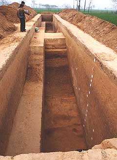 Another important discovery was a ring moat of the early Shang Dynasty (16th-11th centuries BC). It lay between the old city wall and the Xia Dynasty moats with which it ran parallel. Unlike the moats of the Erlitou culture, the Shang ring moat was shaped like a trumpet in cross-section, 13-15 meters wide at the mouth and just 1.5 meters wide at the bottom. Its depth varied from 4.0 to 6.8 meters.