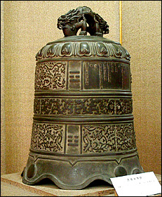 You can find a small bronze bell at the exhibition hall of "Exquisite Ancient Bells." The splendid piece of workmanship is 0.62 meter in height, 0.46 meter in rim diameter and 55 kilograms in weight. The entire bell is decorated with interlocking floral patterns and interlaced hydras patterns and bears an inscription of 104 characters. The delicate carving and fine workmanship demonstrate the high dignity and romantic charm of imperial objects. The inscription proves that the bell was cast for the Shanyuan Nunnery by Yinyu, the 15th son of Emperor Kangxi, in the 58th year of the reign of Kangxi of the Qing Dynasty (1719).
