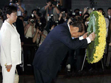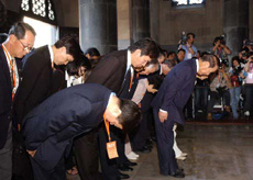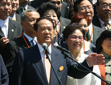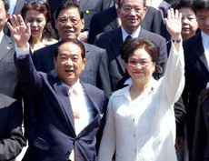 Soong waves his hands to people at Sun Yat-sen's Mausoleum.