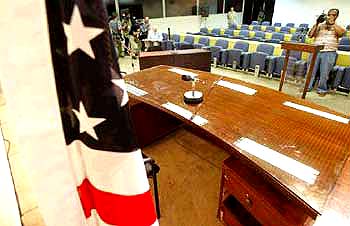 A cameraman films in a courtroom in the so-called "Green zone" in the Iraqi capital in Baghdad on May 18, 2004. Specialist Jeremy Sivits, 24, of Hyndman, Pennsylvania, the first of seven US soldiers charged with abusing prisoners in Abu Ghraib prison faces a special court martial on Wednesday. (China Daily/Reuters)