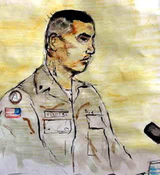 A sketch handed out by a US military court artist shows Specialist Jeremy C. Sivits in a court room in the "Green Zone" in Baghdad, May 19, 2004. The court-martial sentenced Sivits to one year in jail over the abuse of Iraqi prisoners on May 19. (China Daily/Reuters)