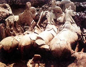 There were passageways to the underground tomb from the four directions of east, south, west and north. These passages were very large and peculiar in layout. For example, horses and chariots were excavated in one of the chambers in the western tomb passage. Some were painted wood with canopies, others were bronze, hitched to horses and decorated with colored drawings. Every chariot had a single shaft and double wheels and was harnessed to four horses. These bronze chariots and horses, excavated in November I980, were two groups of imperial chariots: Four of "security" and four high ones. High chariots, driven by drivers wearing swallow-tailed caps, battle robes and swords preceded the "security" chariots ridden by drivers sitting back to the rear. The castings are in proportions half the size of live men, horses and chariots. These vivid excavations are precious bronze arts.