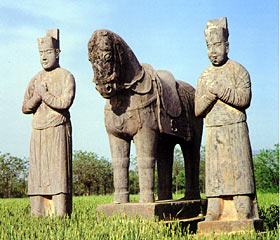 Yongchang Mausoleum: The mausoleum of the founding Northern Song Emperor Tai Zu (Zhao Kuangyin), two kilometers west of Yongan Mausoleum. Zhao Kuangyin was buried here in the 2nd year of the reign of Tai Ping Xing Guo (977). The base is 60 meters long east to west, 62 meters from north to south and the tomb is 21 meters high. There remain seven stone lions guarding the gates, seven stone human statues, four stone sheep, four stone tigers, four stone horses, two stone unicorns, two stone phoenixes, two stone elephants and two stone ornamental pillars.