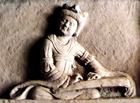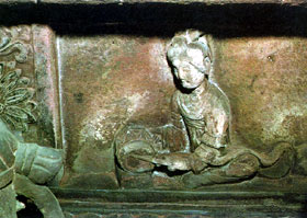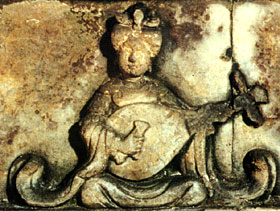 The Middle Chamber, larger than the others, is the main room in the Underground Palace. At its center is a "Sumeru throne" built of bluish-white marble and serving as the coffin platform, on which are placed Wang Jian's inner and outer coffins. On the east, west and south faces of the platform are exquisite sculptures of female professional dancers and musicians. On the south face are two carvings of dancers, and one carving of a pipa (a plucked string instrument with a fretted fingerboard) player and another of a clapper beater. On the east face are ten carvings of drum beaters, di (bamboo flute) players and others. On the west face are ten carvings of chi (single-tube transverse bamboo flute) and panpipe players and others.