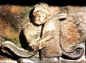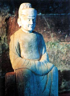 In the Back Chamber is an "imperial bed" on which Wang Jian's stone statue is set. Ninety-six centimeters high, the statue sits upright, wears a folded head dress and a robe girdled at the waist with a jade belt. The hands are interlinked in the long, narrow sleeves. With deep-set eyes under heavy eyebrows, a high bridged nose and prominent cheekbones, and a solemn, serene countenance, the visage basically matches the image of Wang Jian depicted in historical documents.