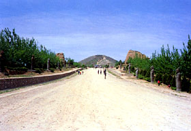 Beyond the stone tablets and on the right side of the spirit path were 61 stone figures attesting to the Tang Dynasty's power and prosperity as well as its friendly relations with minority peoples in frontier areas and with other central Asian countries. These 6I figures of chief-rains and foreign guests were ordered here by Wu Zetian to commemorate the minority chieftains and foreign special envoys who attended the funeral. Wearing tight-sleeved clothes, broad belts and leather shoes, these figures cup their hands in front in an attitude of prayer. More than half of them had their heads defaced, but the only two, in the western row, whose heads are complete, have prominent noses and deep eyes, and were clearly from the Western Regions or Central Asia. Some of the figures had their nationalities, official titles and names on their backs.