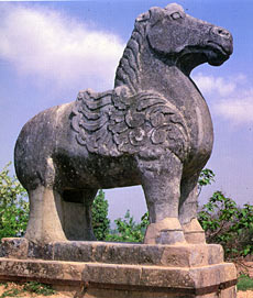 Beyond the stone horses were ten pairs of stone figures, named Shi Ong Zhong, modeled after the emperors' bodyguards. With helmeted heads and heavy long robes, the figures stood with sword in hands, eyes straight ahead, playing a major role in creating a majestic atmosphere in front of the tomb.