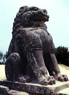 In front of each of the inner wall's four gates were a pair of stone lions; the best are the pair by Rosefinch Gate. Of heroic proportions, this pair had curved hair, bulging eyes, big mouths and sharp teeth, presenting perfect images of stem and fierce-looking lions. They are symbols of dignified, autocratic Tang rulers.