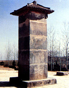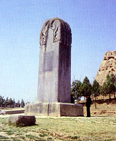Further on were two stone tablets. The east one, called Uncharactered Tablet, was erected blank as a term of Wu Zetian's will. Her will read: "My achievements and errors must be evaluated by later generations, therefore carve no characters on my stele." This blank tablet was 6.3 meters high, 2.1 meters wide and 1.5 meters thick. During the Song and Jin dynasties, however, quite a few travelers did inscribe it, changing the uncharactered tablet into a charactered tablet. Altogether thirteen sets of inscriptions were counted, though most of them have been blurred by time. Only the 'Travel of the Military Commissioner of the Campaign Commander of the Jin Dynasty" in Nüzhen script, with a Chinese translation beside it, was well preserved. Now, the Nüzhen script has disappeared. This rare script was a precious aid for the study of Nüzhen scripts and the history and culture of China's minority nationalities.