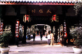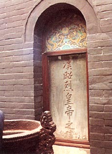 The Zhao Lie Temple commemorating Liu Bei was built for the Huiling Mausoleum. It is located by the mausoleum. Originally, this temple was separated from the Zhuge Liang Memorial Temple. However, since Liu Bei had a dose relationship with Zhuge Liang, the Zhao Lie Temple and the Zhuge Liang Memorial Temple were gradually, over the centuries, combined into one. Actually the Zhuge Liang Memorial Temple is the Zhao Lie Temple, this can be seen in a sign above the gate of the temple, on which are engraved in golden characters "The Zhao Lie Temple of Han. "