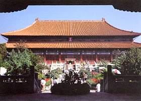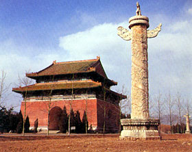 Some distance inside the gate is the tablet pavilion with a double eave roof and white stone ornamental pillars at each of the four corners. The four stone ornamental pillars, decorated with relief carvings, are similar in size and design to those in front of Tian'anmen Gate tower in Beijing.