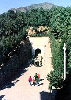 Great Palace Gate stands between two hills, Mangshan (Python Hill) on the east and Huyudan (Tiger Gorge Hill) to the west. All the emperors were superstitious and were especially keen on practicing geomancy when they chose burial grounds. Python meant dragon and Tiger Gorge referred to white tigers. There is an old saying, "A dragon on the left and a white tiger on the right." The two hills (a dragon and a tiger) were like two guards beside the mausoleum gate, making it dear that the location of the Great Palace Gate was carefully determined. A wall built along the mountains surrounding the tombs was forty kilometers long. Along it were ten gateways (Zhongshan, Dongshan, Laojuntang, Xianzhuang, Hulling, Zhuishi, Yanzi, Desheng, Xishan and Zhazi), each with a fortress guarded by imperial troops. Most of the wall and buildings have collapsed but remains can still be seen here and there, giving some idea of the splendid architecture.