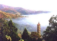 The Tree-Covered Imperial Audience Tablet: Located to the southwest of the Chaoyang Caves, this group of steep cliffs with numerous trees resembles a giant hu-the rectangular tablet officials held before themselves in the presence of the emperor.
