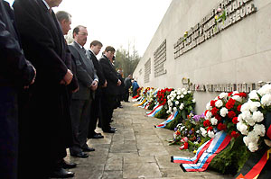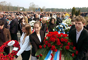 Survivors of the Nazi death camp Bergen-Belsen mark the 60th anniversary of the camp's liberation in 1945 and mourn for victims of the Holocaust, April 17, 2005. (Xinhua Photo)