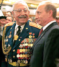 Russian President Vladimir Putin (R) poses for a picture with World War II veterans in the Bolshoi theatre in Moscow May 8, 2005. Putin on Sunday urged leaders of the 12-member club of ex-Soviet states, some of them already shifting to the West, to stick together to fight extremism and terrorism. (Xinhua/Reuters Photo)
