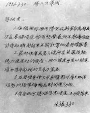 In this telegram, Commander-in-chief Zhu De and Chief Political Commissar Zhang Guotao on Mar. 30, 1936 ordered the second and sixth Red Army groups to march northward to join forces with the Fourth Front Army.