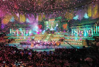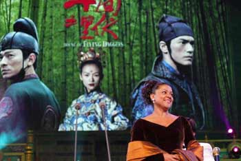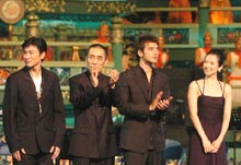 Chinese Hong Kong actor Andy Lau (1st, L), Mainland Chinese film director Zhang Yimou (2nd, L), actor Takeshi Kaneshiro (2nd, R) and actress Zhang ZiYi attend the global premiere of their new film 'House of Flying Daggers' in Beijing, July 10, 2004. The premiere was held at the Beijing Workers' stadium on Saturday. (Xinhua Photo)