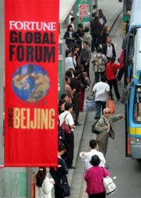 Residents wait for buses below banner for the Fortune Global Forum in Beijing Monday May 16, 2005. More than 500 business and political leaders will take part in a three-day forum titled 'China and the new Asian Century', which will be opened by Chinese President Hu Jintao later Monday.