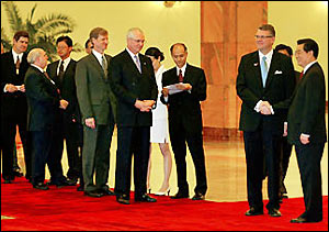 Forum attendants seize the rare opportunity of taking a picture with President Hu Jintao yesterday at the Great Hall of the People in Beijing.