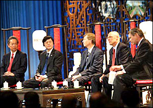 Speakers at the first General Session: The New Asian Century. They are (L-R) Nobuyuki Idei, Chairman and Group CEO of Sony Corporation; Yang Yuanqing, President and CEO of Lenovo Group Ltd; John B Menzer, President and CEO of Wal-Mart International; Henry Paulson Jr., Chairman and CEO of The Goldman Sachs Group; and Rik Kirkland, Global Editor of Fortune.