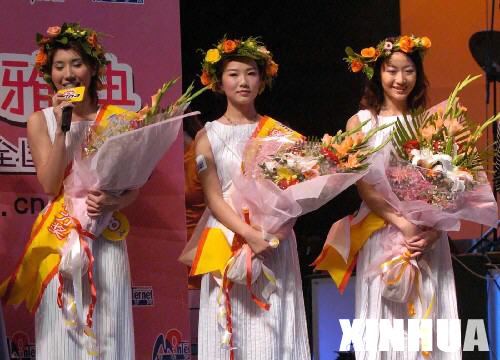 Wang Oulei, Luo Zhijuan, and Yan Yuanyuan react after winning the final competition to enter the cheer team for the upcoming Athens Olympics. Eleven girls competed in the final in Beijing, July 20, 2004.