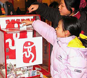 Two girls donate their pocket money for the Indian Ocean tsunami victims during a New Year concert in the Great Hall of the People in Beijing on December 31, 2004.