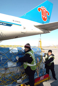 | Staff members of Capital International Airport load relief materials onto a plane at the airport in Beijing, capital of China, Jan. 3, 2005. The fourth batch of 100 tons of relief materials including medicine, food, towels, tents and generators was airlifted on Monday to Sri Lanka, one of the tsunami-hit nations in the Indian Ocean. |