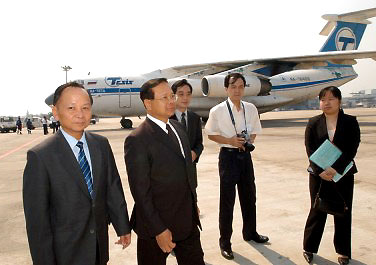 | Chinese ambassador to Thailand Zhang Jiuhuan (L1) handed over Chinese relief materials to official of the Thai Foreign Ministry at the Bangkok International Airport on Jan 4, 2005. A batch of relief materials worth US$ 905,000 arrived Bangkok that day and was delivered to the tsunami-stricken aera in south Thailand. |