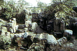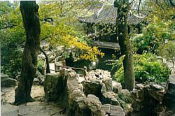 The West Garden consists of studies, pavilions and courtyards. A limestone rockwork sits at the entrance. To the north of the "hill" is the Old House with Woven Curtains. Behind it there is a study, a "L" shaped tower, with rocks, trees and flowers in front of it.