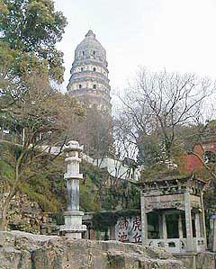 Tiger Hill Pagoda: The pagoda standing on the hill's summit is part of the Yunyan Temple. The oldest pagoda in Suzhou, it serves as a landmark of the city. Built during the Northern Song Dynasty (959-961), the 48-meter-high seven-story octahedron has leant towards the northwest in the past 400 years.