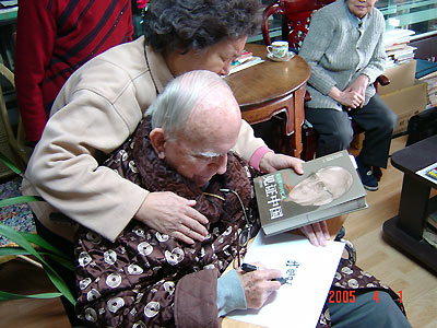 During an interview with Xinhua News Agency on April 4, 2005, Israel Epstein at home inscribed the title of his memoirs, "My China Eye," published recently in San Francisco, the United States. (Xinhua Photo)