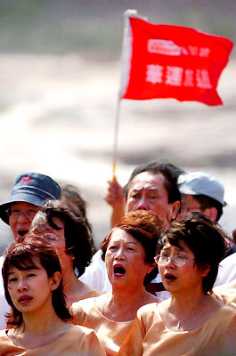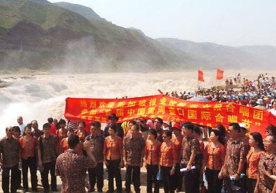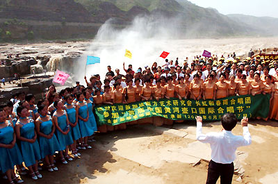 An international chorus festival opens June 11, 2005 at the famous Hukou falls on the Yellow River in Shanxi Province. Four overseas Chinese choirs from Singapore, Malaysia and Australia attended the festival. Chinese singers from home and abroad sang songs in commemoration of the 60th anniversary of the victory of the War of Resistance Against Japanese Aggression (1937-1945) and the centennial birth anniversary of Xian Xinghai. Xian, a great musician, composed at the Hukou falls in 1939 the Yellow River Cantata, a household song that inspired the Chinese people to fight against Japanese aggression. (Xinhua photos)