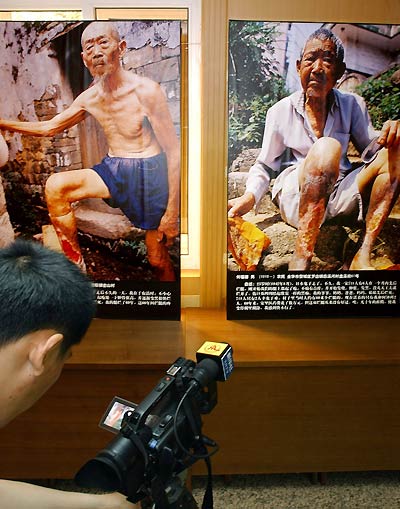 The inaugural ceremony is held in Hangzhou, capital of east China's Zhejiang Province, June 15, 2005, for launching the publication of Blood-weeping Accusations, a documentary picture album revealing for the first time the living conditions of the survivors from Japan's anthrax and glanders attacks during its aggression against China. Since 2001, Li Xiaofang from Hangzhou Sanatorium of the Nanjing Military Command of the People's Liberation Army interviewed more than 200 survivors living in Zhejiang and Jiangxi, and compiled the album composed of over 200 photos, the survivors' account of their wartime experiences, and investigation reports by Chinese and foreign experts. (Xinhua photos)