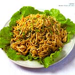 2. Boil the chicken breast until it is done. When it cools off, cut the chicken into thin shred. Mix these with the lettuce shred, cold chicken soup, light-colored soy sauce, sugar and MSG, and place the mixture on top of the lettuce leaves on the plate.
