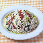2. Put the oil in a pan and when the oil is hot, add the sauage and vegetables, and stir-fry well. Add 1200 g (2 2/5 cups) of water. When it boils, add the salt, MSG, and then the rice. When it boils again, turn the heat to low and cook for about 30 minutes. And it is ready to serve.