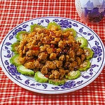 Ingredients: 300 grams (0.66 lb) pork tenderloin 200 grams (0.44 lb) peanuts 5 grams (1 tsp)soy sauce 25 grams (1 1/2 tbsp) sweet bean paste 5 grams (1/6 oz)red chili, presoaked in water 100 grams (7 tbsp) cooking oil 1 egg white 10 grams(2 tsp)mixture of cornstarch and water 10 grams (1 1/2 tbsp) dry cornstarch 10 grmas (2 tsp) cooking wine 2 grams (1/3 tsp) salt 2 grams (1/2 tsp)MSG 5 grams (1/6 oz)finely cut scallions 5 grams (1/6 oz)chopped ginger 25 grams (1 1/2 tbsp) coy bean paste 5 grams (1 tsp) sugar 2 grams (2/5 tsp) sesame oil