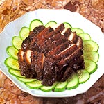 3. Take the meat out of the water and cut into slices 8 cm (3.2 inches) long and 1 cm (0.4 inch) thick. Place the slices in a bowl with the skin side down. Add the scellions, cooking wine, sugar, star anise and soy sauce, and steam for 1 hour.