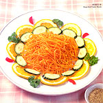 3. Heat the oil to 135-170 ?C (275-340 ?F). Deep-fry the carrot shreds until they become crispy. Drain off the oil, put in a plate and sprinkle on the prickly ash powder onto the carrot shreds.