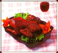 Ingredients: 1 tender hen (about 1,250 g or 2.75 lb), inside removed 20 grams (2/3 oz) mushrooms 20 grams (2/3 oz) bamboo shoots 20 grams (2/3 oz) lotus seeds previously soaked in water 20 grams (2/3 oz) pickled cucumbers 15 grams (1/2 oz) fresh lilies 20 grams (2/3 oz) shelled fresh shrimps 15 grams (1/2 oz) scallops 30 grams (1 oz) cooked ham 25 grams (1 2/3 tbsp) cooking oil 15 grams (1 3/4 tsp) sweet soy bean paste 20 grams (2/3 oz) scallion juice (from soaking chopped scallions) 20 grams (2/3 oz) ginger juice (from soaking chopped ginger) 2 1/2 grams (2/5-3/5 tsp) sugar 2 grams (1/3 tsp) MSG 20 grams (1 2/3 tbsp) cooking wine 10 grams (2 tsp) water 2,000 grams (4 cups) mixture of water with maltose suger