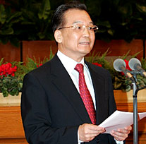 At the gathering presided over by President Hu Jintao, Wen extended festival greetings to people of all ethnic groups in China, reviewed China's significant achievements in 2004, and listed the tasks for 2005.