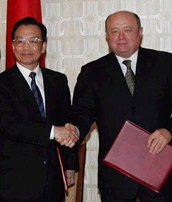 China and Russia will take measures to implement cooperative projects in oil and natural gas, including the construction of pipelines between China and Russia, says a communiqué signed by Premier Wen Jiabao and Russian Prime Minister Mikhail Fradkov in Moscow on Friday. In the communiqué, the two nations recognized each other's full market economy status. China also reiterated its strong support for Russia's bid to join the World Trade Organization (WTO).