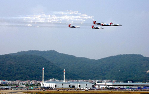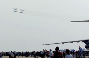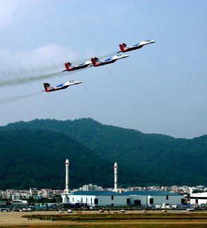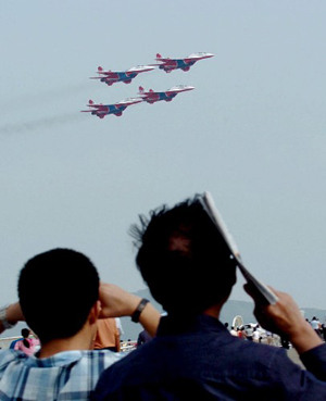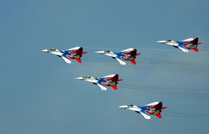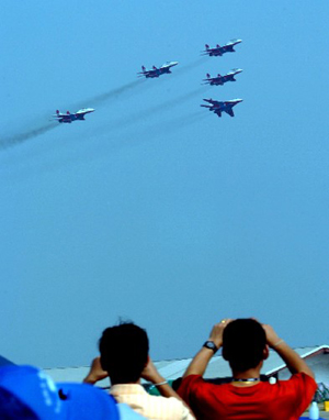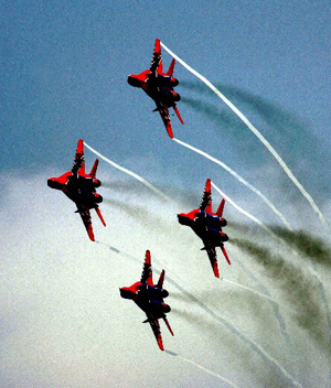 Mig-29 fighter planes of the "Swifts" aerobatics team of the Russian Air Force perform during the Fifth Chinese International Aviation and Aerospace Exhibition (CIAAE) in Zhuhai, a city in south China's Guangdong Province, November 4, 2004.