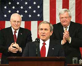Bush spoke from the rostrum of the House chamber, with Vice President Dick Cheney and House Speaker Dennis Hastert seated behind him. More than two dozen guests were invited to sit in the first lady's box with Laura Bush, including relatives of fallen US troops, a pilot helping tsunami victims and individuals whose presence were meant to underscore Bush's domestic agenda, such as education, social security medical malpractice and other areas.