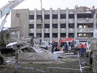 Police and interior ministry soldiers sealed off the site as workers with the republic's emergencies ministry and federal troops searched for victims in the rubble of the building, which housed the local administration, police and FSB security services.