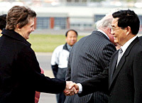 The Chinese president was met at the airport by New Zealand Governor-General Dame Silvia Cartwright, Prime Minister Helen Elizabeth Clark, Chinese Ambassador Chen Mingming and staff members of the Chinese embassy.